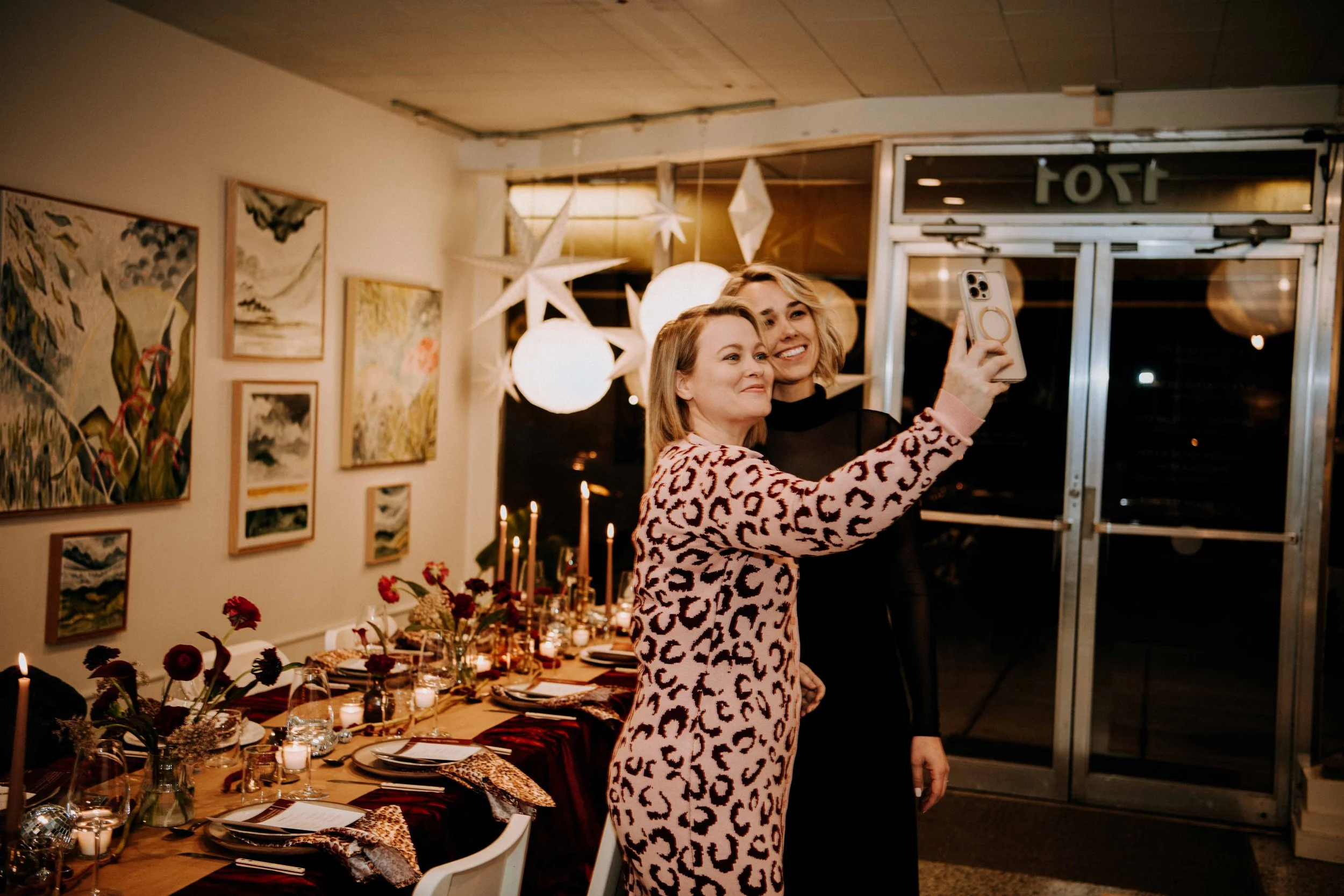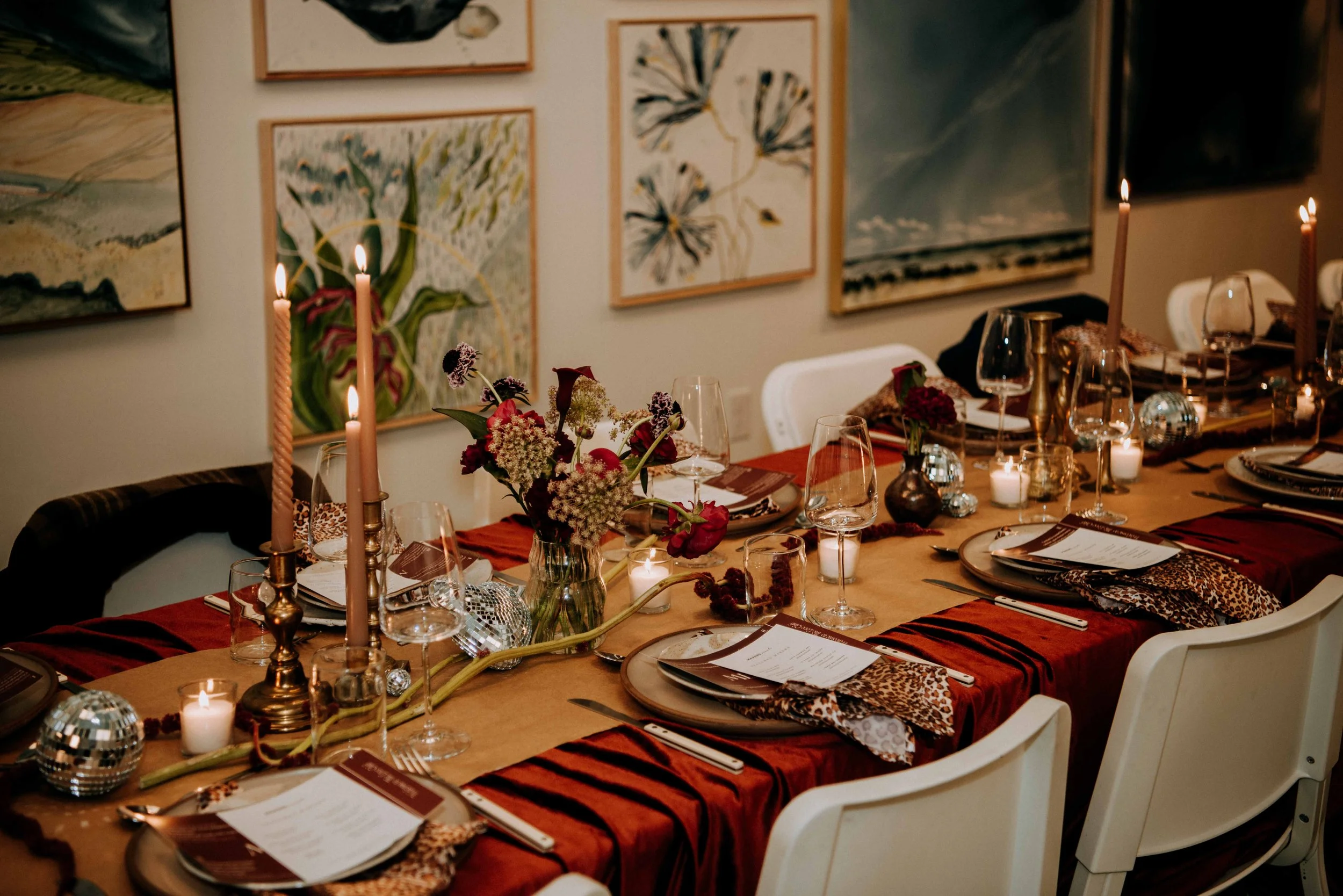 The tablescape was styled with a mix of disco balls, vintage candlesticks, leopard print napkins and florals from Mermaid City Flowers.